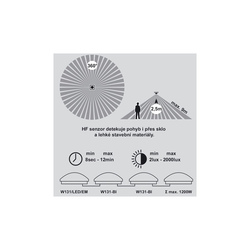 Senzor pohybu: HF čidlo pohybu funguje na principu mikrovln, které detekují pohyb i přes sklo a lehké stavební materiály.