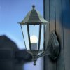 Krásné elegantní venkovní nástěnné svítidlo v retro designu z černého kovu se skleněnými průhledy s hlavou lampy směřující nahoru