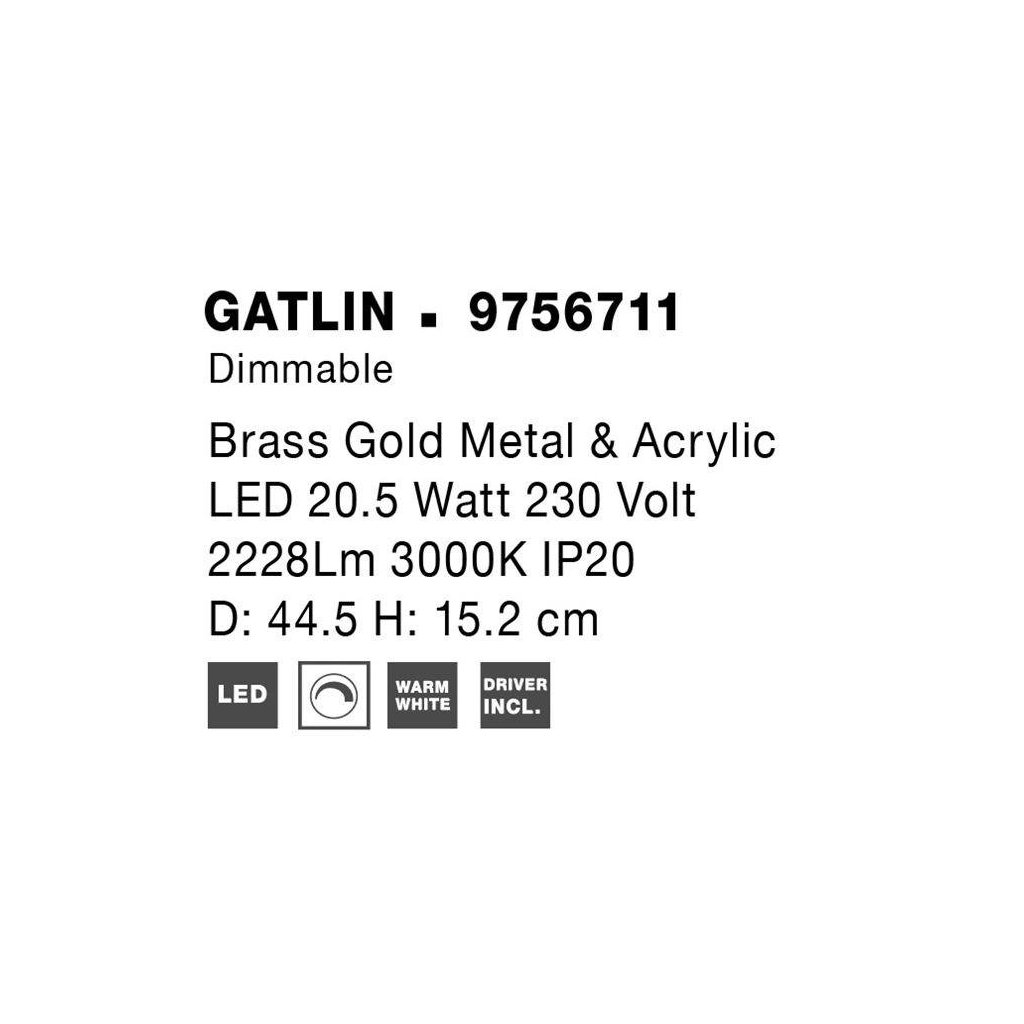 Stropní svítidlo GATLIN mosazný zlatý kov a akryl LED 20.5W 230V 3000K IP20 stmívatelné - NOVA LUCE